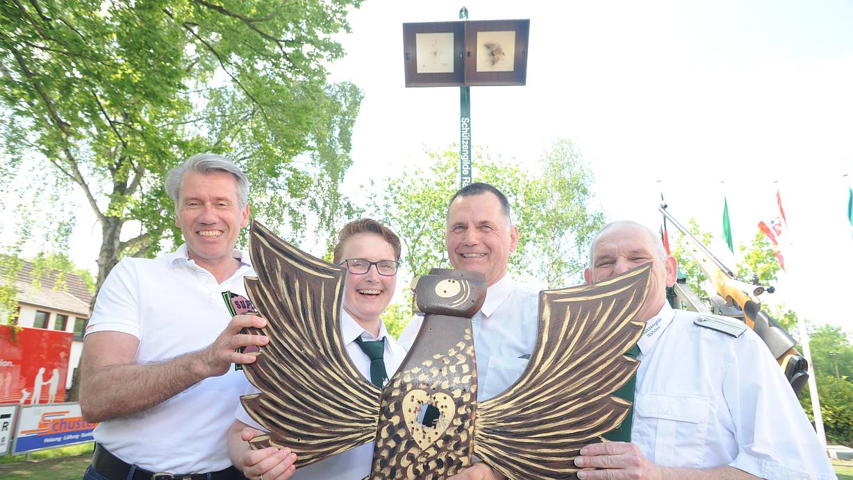 Gute Laune am Adlerstand: Die Rahdener Schützengilde feierte 2019 ihr 175. Jubiläum, heuer steht der 180. Geburtstag an. Horst Fahrmeyer (3. v. l.) wurde 2019 Jubiläumskönig und Kaiser der Rahdener Schützengilde - und blieb das vier Jahre lang. Ihm gratulierten damals auch Bürgermeister Bert Honsel, Vizekönigin Yvonne Beischer und Torsten Wiefhoff. | © Joern Spreen-Ledebur