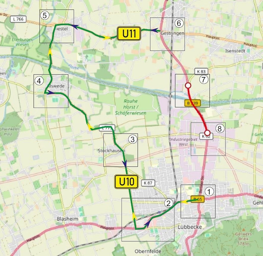 Die Umleitung erfolgt während der ersten beiden Bauabschnitte in beiden Fahrtrichtungen über die Bohlenstraße (B65), die Westerbachstraße, die Straße Am Esch in Stockhausen und Hedemer Straße nach Alswede, weiter über die Fiesteler und Blasheimer Straße nach Fiestel und die Gestringer Straße wieder auf die B239.