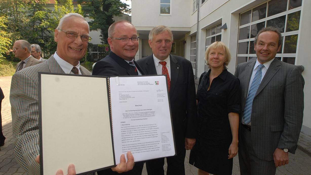 Erinnerung an bessere Zeiten: Im August 2009 übergab Karl-Josef Laumann (Mitte), damals wie heute NRW-Gesundheitsminister, in Rahden einen Förderbescheid zum Krankenhaus-Umbau. Darüber freuten sich Wolfgang Hesse (damals MKK-Verwaltungsrat), der damalige MKK-Chef Matthias Bracht, Cornelia Schmelzer (damals MKK-Verwaltungsrat) und der damalige Landrat Ralf Niermann. Im Oktober 2014 war Wiedereinweihung des sanierten Hauses. | © Joern Spreen-Ledebur
