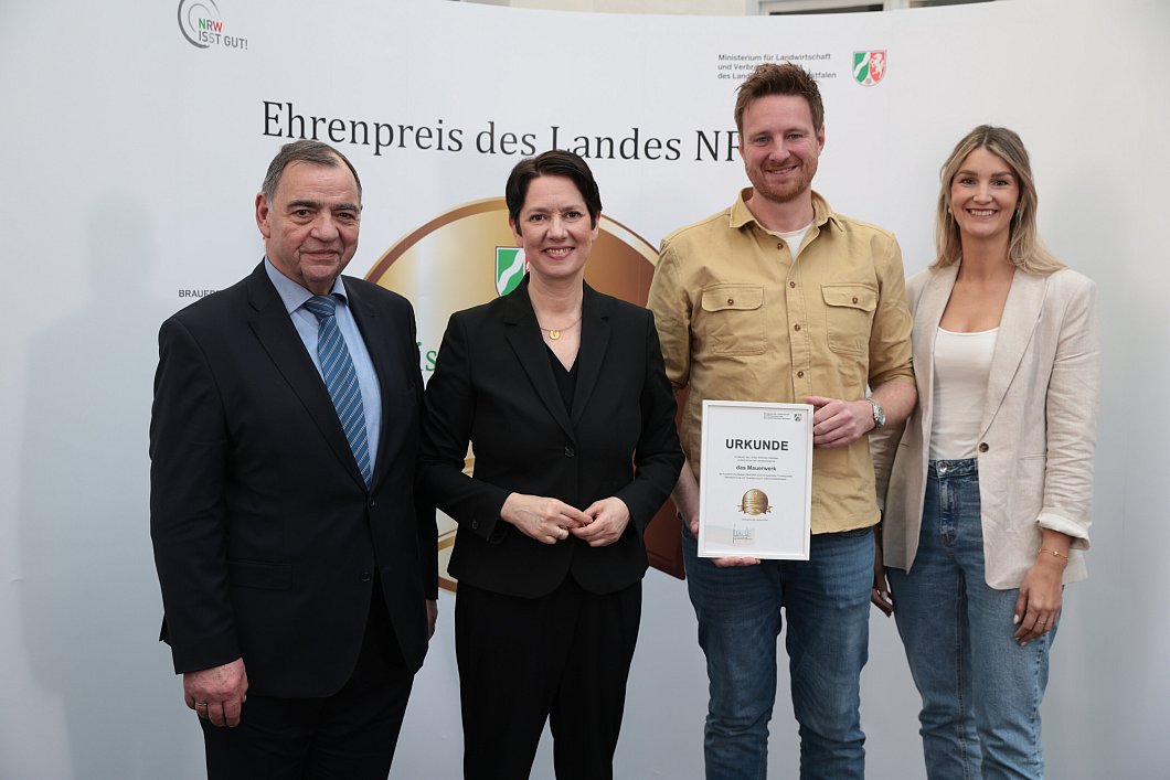 81 herausragende Bäckereien, Fleischereien, Konditoreien und Brauereien aus ganz Nordrhein-Westfalen erhalten in diesem Jahr den Ehrenpreis des Landes für ihre Erzeugnisse und ihre Betriebsführung. Gleich zwei Bad Oeynhausener Betriebe - das Café „Mauerwerk“ aus Dehme und die Fleischerei Timmerberg aus der Südstadt - nahmen am Montagnachmittag die Auszeichnung von der Landesministerin für Landwirtschaft und Verbraucherschutz, Silke Gorißen, in Düsseldorf entgegen.