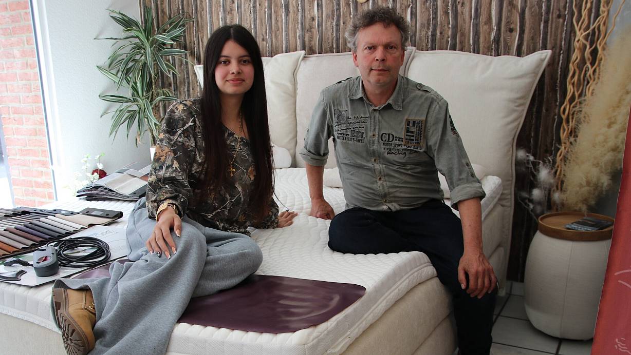Wilhelm Werkmeister und seine Tochter Lilli haben es sich im Ausstellungsraum in der Niedernstraße bequem gemacht. Das Wasserbetten Studio besteht an dieser Stelle seit genau 25 Jahren. | © Frank Hartmann