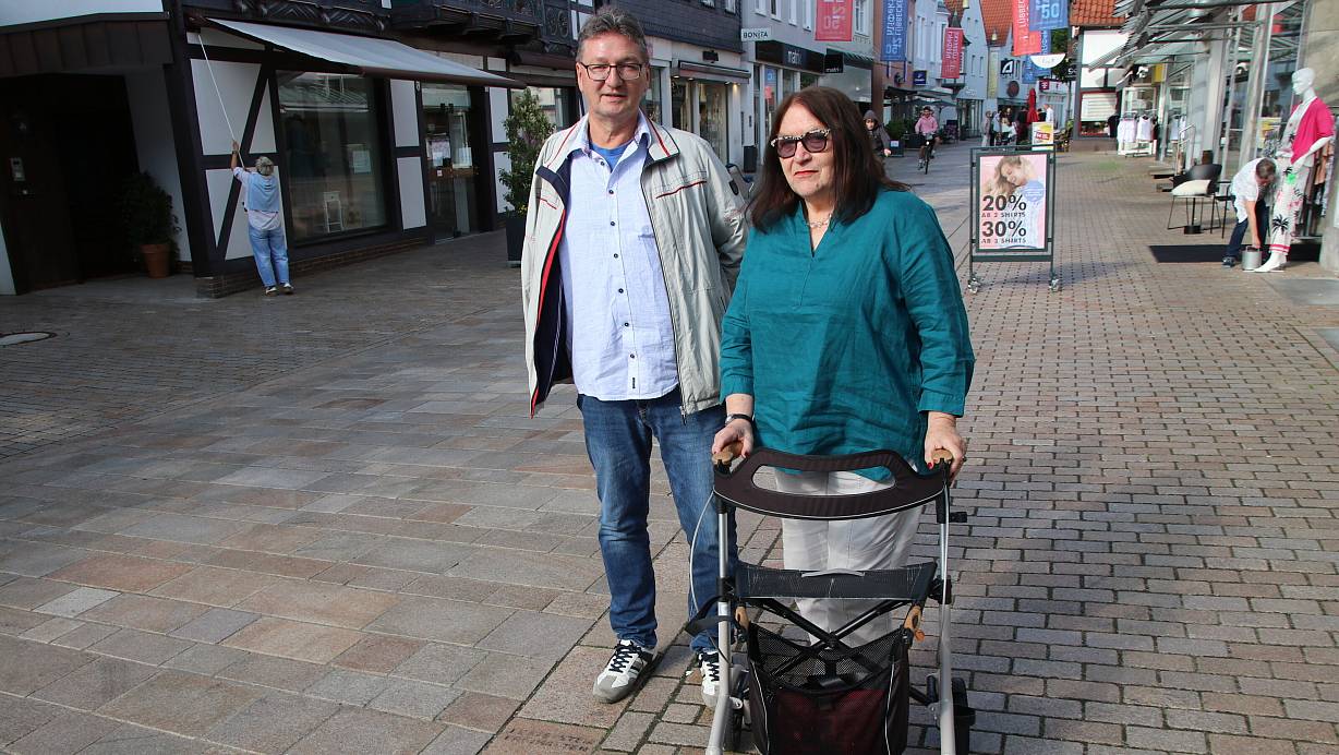 Martin Schmidt und Karin Wiegmann stehen dem Lübbecker Beirat für Inklusion und Teilhabe vor. Das Piktogramm vor ihren Füßen, das auf Sehbehinderte hinweist, ist kaum noch zu erkennen und soll erneuert werden. | © Frank Hartmann