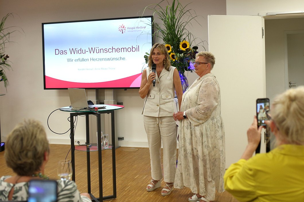 Kerstin Hensel, die dem Diakonischen Werk im Kirchenkreis Vlotho vorsteht, und Anne-Meike Thöne, beim Diakonischen Werk im Kirchenkreis Vlotho zuständig für die Hospiz- und Trauerarbeit, waren zu diesem Anlass auf der diesjährigen After-Work-Veranstaltung auf Schloss Benkhausen zu Gast und hatten neben vielen Informationen auch einige berührende Geschichten und zahlreiche Fotos von Ausflügen mit dem Wünschemobil dabei.