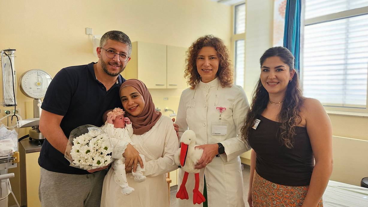 Freuen sich, dass es der kleinen Ella gut geht: die Eltern Mohammed und Israa Alobeid aus Stemwede (v. l.) mit Klinikdirektorin Isabela Scheibner und Hebamme Tuba Özarac. | © Irma Mujanovic/MKK