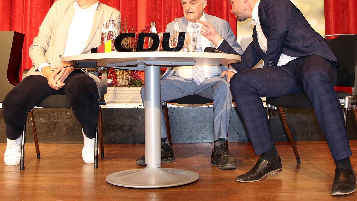 Moderiert von Stadtratsbewerber Christian Spönemann (l.) und an der Seite von Bürgermeisterkandidat Bent-Maria Grote (r.), beantwortete NRW-Innenminister Herbert Reul (M.) Fragen aus dem Publikum. | © Frank Hartmann