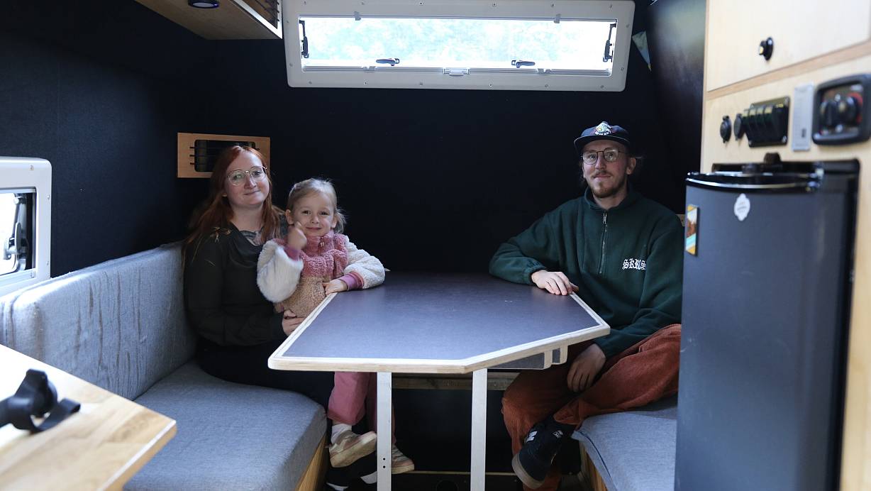 Nadine, Leon und Viktoria genießen die gemütliche Atmosphäre in ihrem umgebauten Feuerwehrwagen-Van. | © Lena Kley