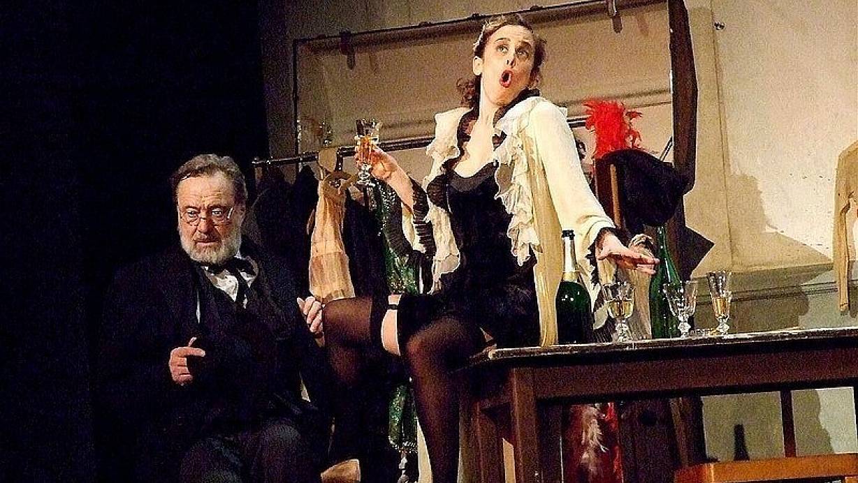 Frank Matthus nutzt diese in seiner Produktion für das Eurostudio Landgraf gekonnt aus. Er inszeniert in einem für Tourneetheater recht aufwändigen Bühnenbild, das im Mittelteil sogar eine Drehscheibe einhält. Ein eigener dunkelroter Taft-Vorhang vermittelt von Anfang an das Ambiente billigen Tingeltangels und eröffnet Spielmöglichkeiten, die der schwere Samt der theatereigenen Ausstattung nicht zuließe.