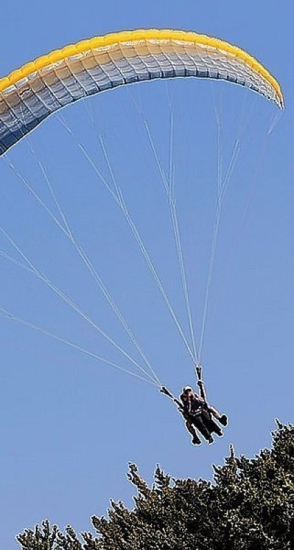 Weit komme ich allerdings nicht. Bereits nach zwei Schritten werde ich in die Luft gezogen. Sekunden später steige ich in luftige Höhen, während Menschen, Autos und Häuser unter mir aussehen wie Miniaturen. Noch hängen wir am Schleppseil. Als wir fast senkrecht über der Seilwinde stehen, bekomme ich die Anweisung, die Verbindung zu kappen.