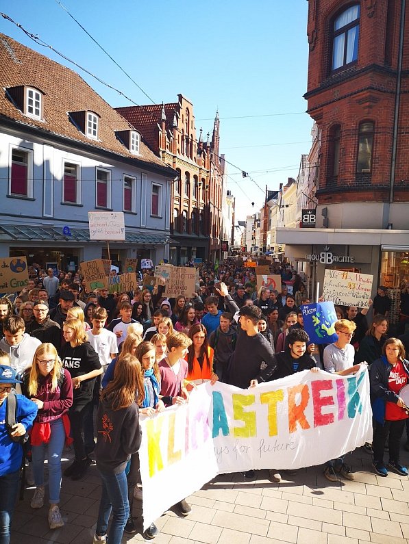 Bereits vor dem Start der Demonstration füllt sich der Marktplatz von Minute zu Minute, es haben sich zu diesem Zeitpunkt bereits ungefähr 1.000 Menschen versammelt. Aus den Boxen tönt "Another Brick in the Wall" von Pink Floyd und "Wind of Change" von den Scorpions. Schüler, aber auch Vertreter von Vereinen und die "Oldies for Future" sind vor Ort. Etliche Demonstranten haben Plakate mitgebracht. "Früher war der Fisch in der Packung, jetzt ist die Packung im Fisch", "Save our World" oder "Es gibt keinen Planet B" steht auf ihnen.