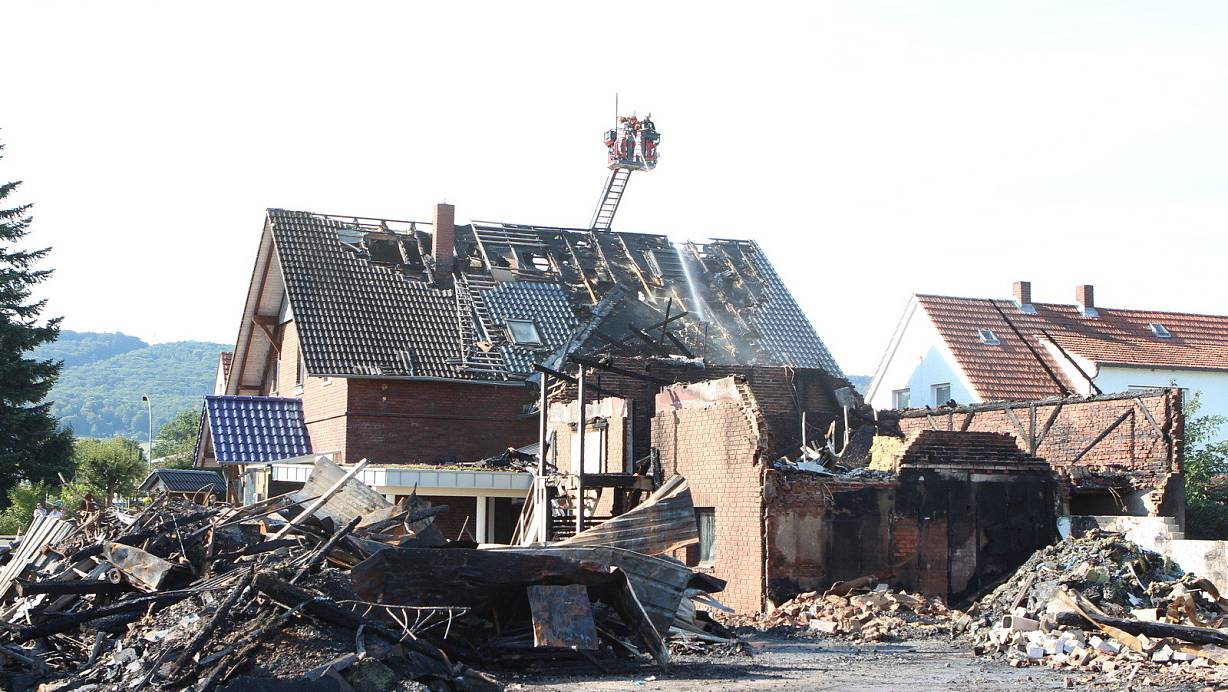 Vor Ort bietet sich dem Betrachter ein trauriges Bild. Auch das angrenzende Wohnhaus, in dem vier Erwachsene und ein Kind lebten, hat es erwischt - mit schlimmen Folgen für die Bewohner.