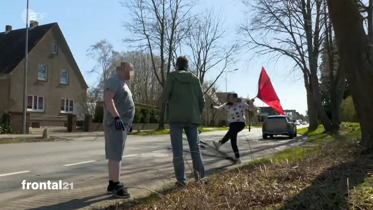 Erregte Szene: Schwungvoll tritt die Verlobte des Terrorverdächtigen Thomas N. vor dessen Haus in der Kutenhauser Straße gegen das am Boden liegende Stativ des Fernsehteams. Ihr Sohn (links) hat sich Handschuhe angezogen. | © ZDF