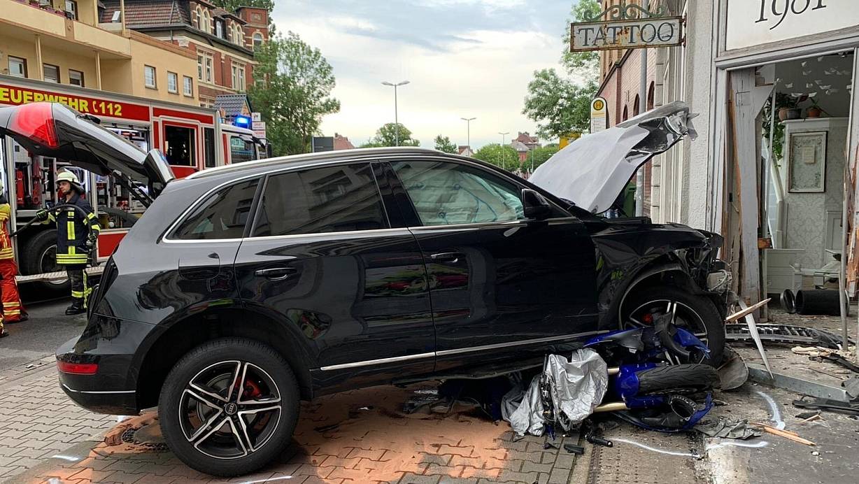 Ein schwarzer Audi Q5 war am Unfall beteiligt, nahm einen parkenden Roller mit und krachte vor den Eingangsbereich eines angrenzenden Tattoo-Studios.
