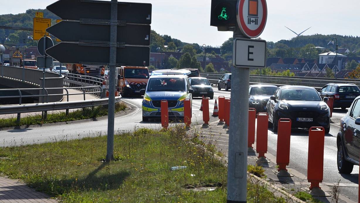 An der Portaner Weserbrücke sperrte zunächst die Polizei die Zufahrt. Der Verkehr wurde über die Portastraße nach Minden umgeleitet. | © Maxiliam Hampel