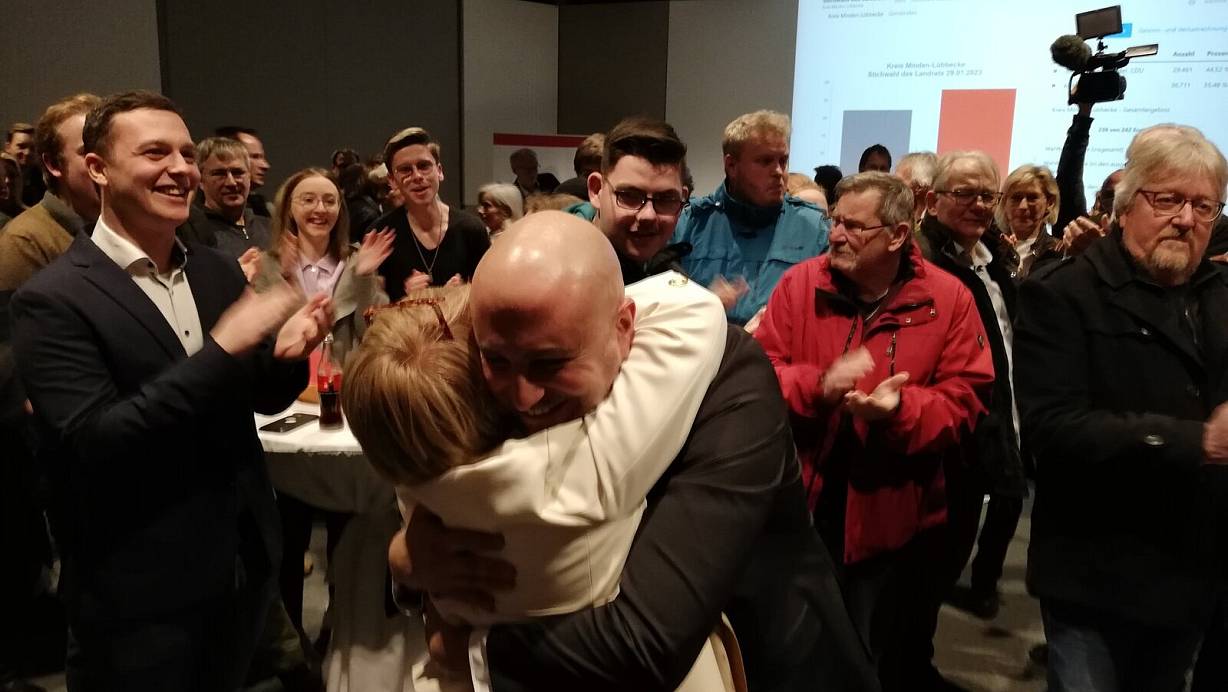 Parteifreunde feiern vor Auszählung des letzten Wahllokals SPD-Landratskandidaten Ali Dogan. | © Joern Spreen-Ledebur