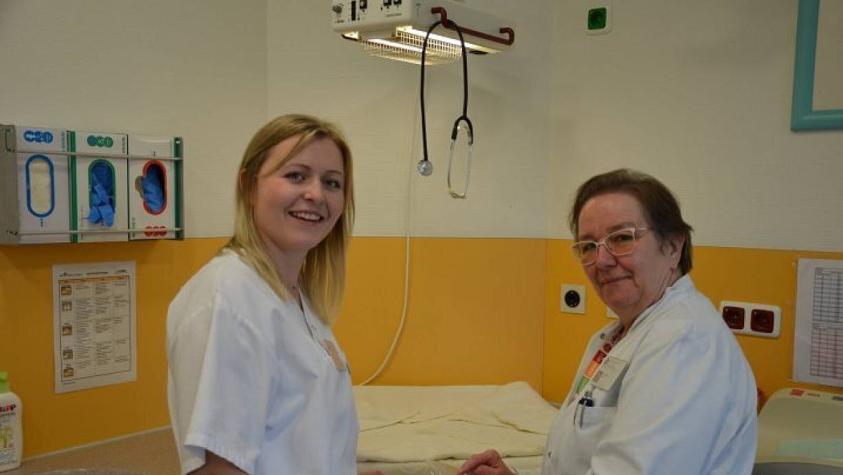 Leonie Rutenkröger und Martina Höfel in einem der Kreißsäle des Johannes-Wesling-Klinikums. Hier haben die Hebammenschülerinnen viele praktische Erfahrungen gesammelt. | © Doris Christoph