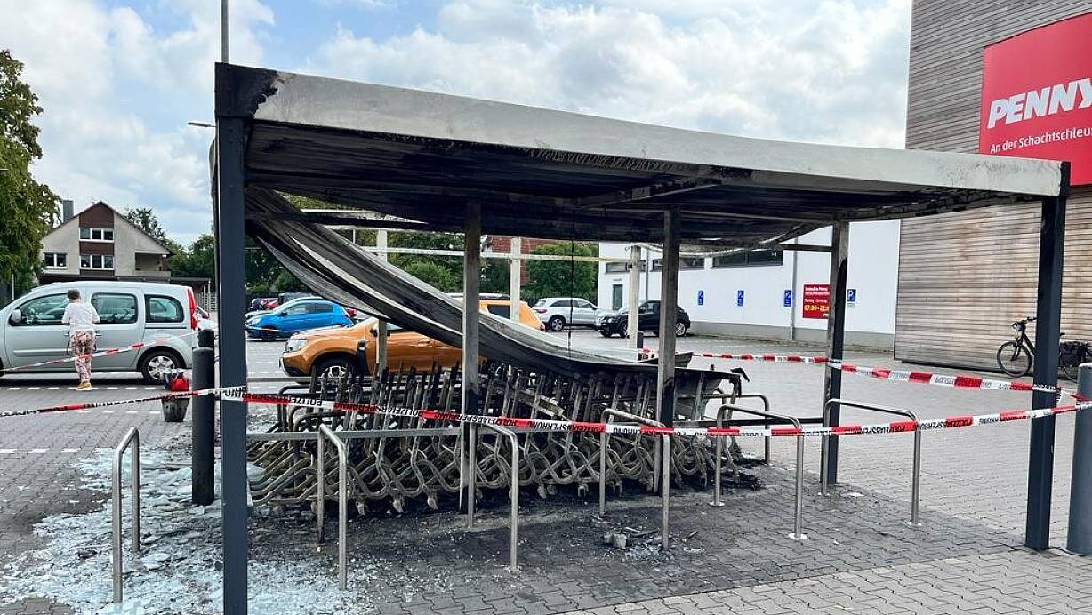 Der Unterstand für die Einkaufswagen des Discounters an der Marienstraße ist vom Feuer komplett zerstört worden. Die Polizei sucht nach dem Brand nach Zeugen. Wer hat verdächtige Beobachtungen gemacht?