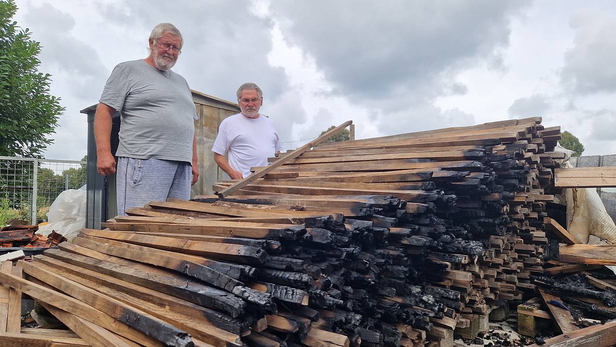 Martin und Manfred Fischer schauen auf den Stapel, der gebrannt hat. | © Ilja Regier