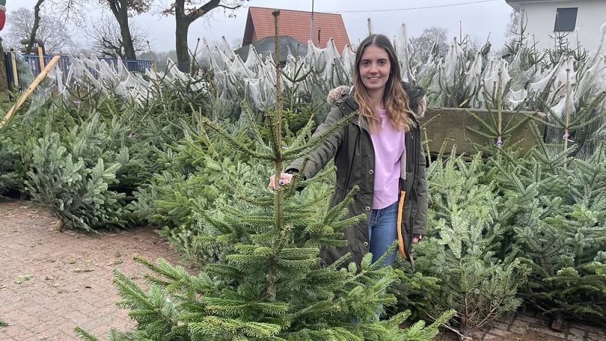 Jana Alsdorf mit einer der rund 400 Tannen, die auf dem Hof Meinert in Minden stehen. | © Janina Pietruschka