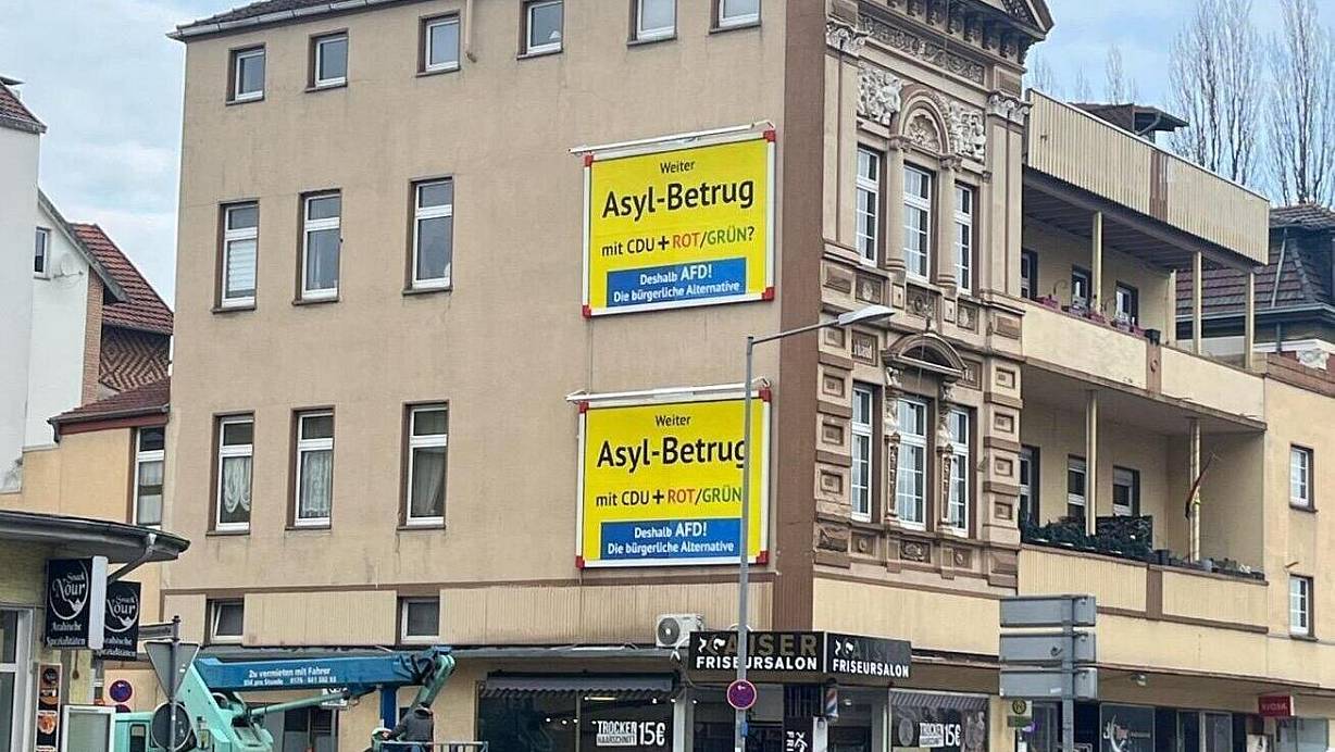 Gelb und groß prangen an vielen Stellen in der Stadt Plakate der rechtsextremen Partei. Hintergrund ist eine millionenschwere Sachspende eines AfD-Unterstützers aus Österreich.