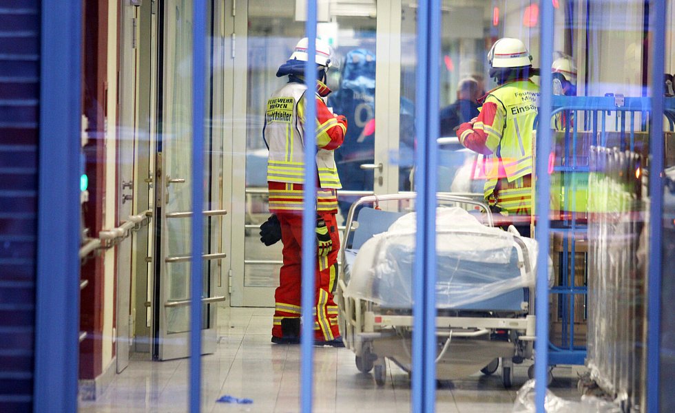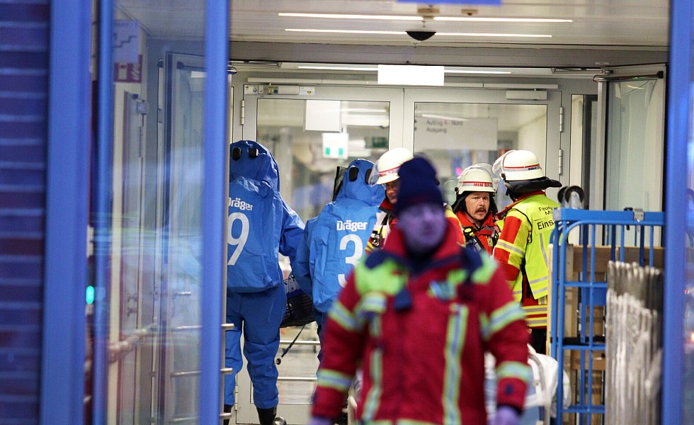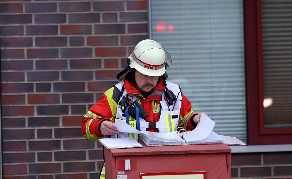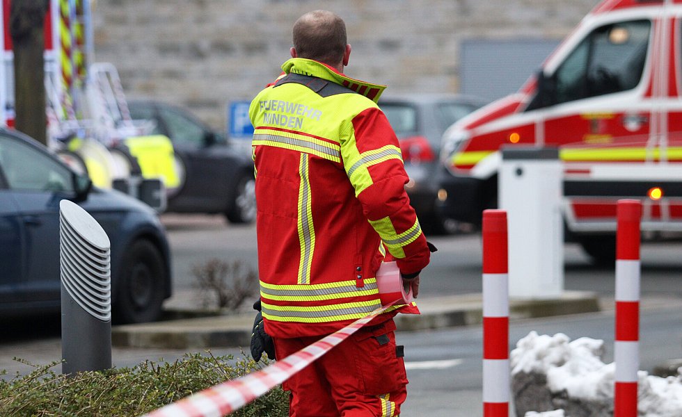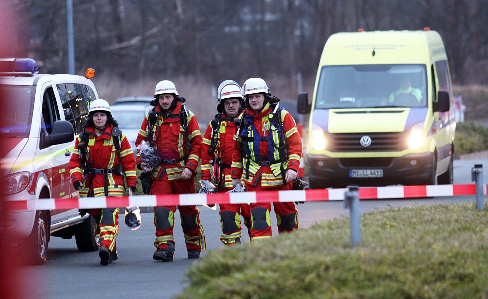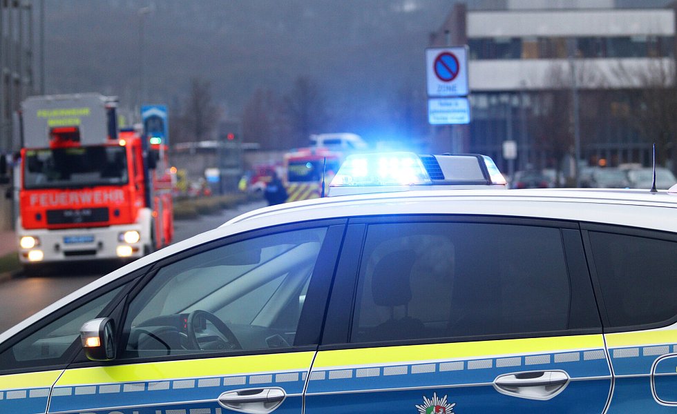 Mehrere Einsatzkräfte der Feuerwehr und Polizei sichern das JWK ab und kontrollieren, ob und wo Chlorgas ausgetreten sein kann.