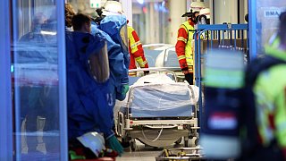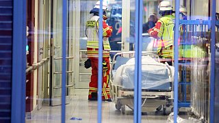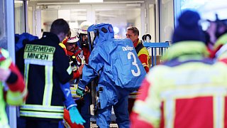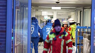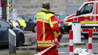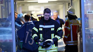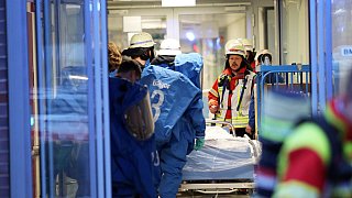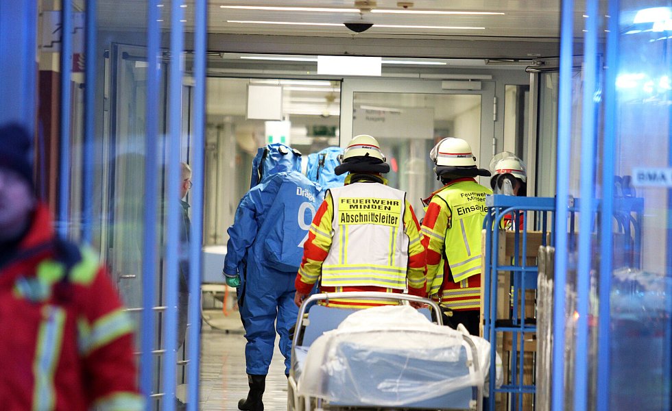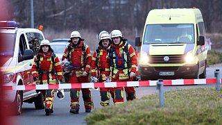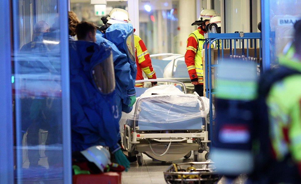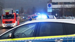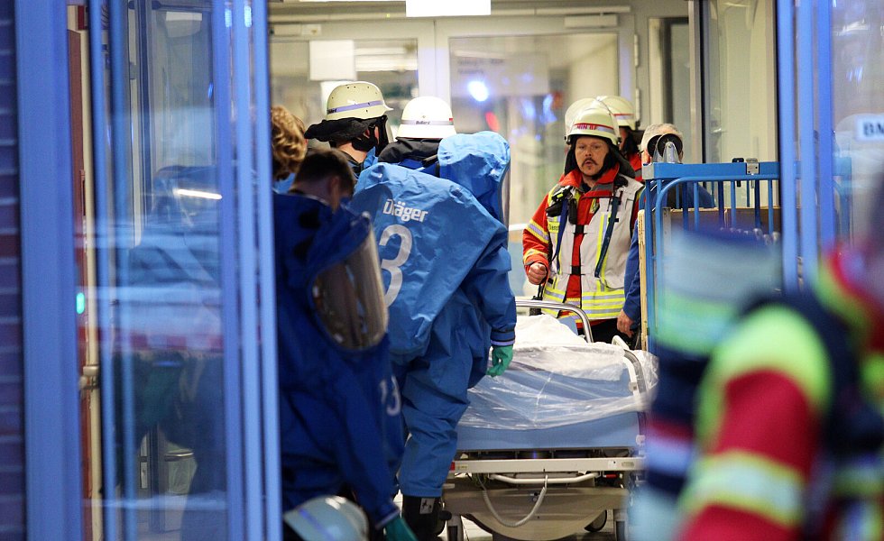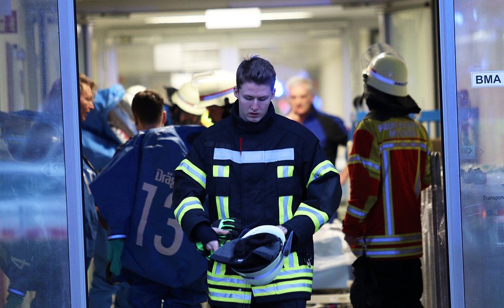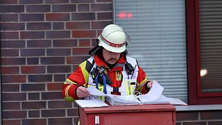 Mehrere Einsatzkräfte der Feuerwehr und Polizei sichern das JWK ab und kontrollieren, ob und wo Chlorgas ausgetreten sein kann.