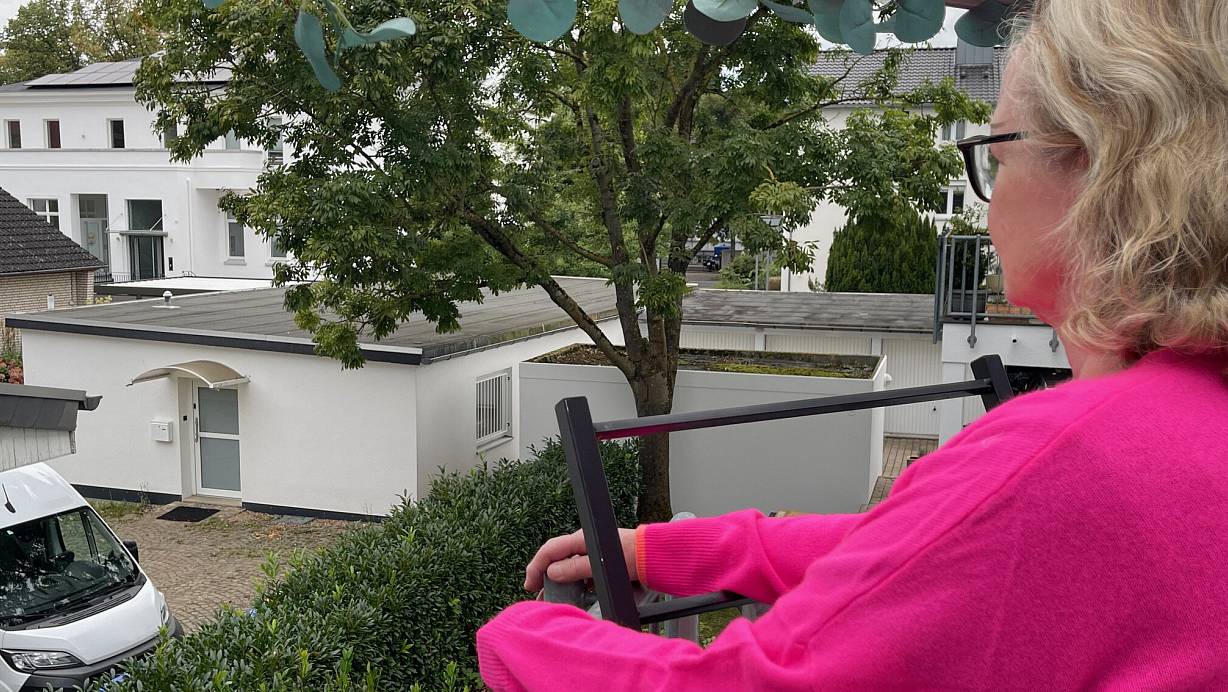 Petra Schugt blickt von ihrem Balkon auf den weißen Bungalow, der als Gästehaus vermietet wird und ihr schlaflose Nächte bereitet. | © Anja Peper