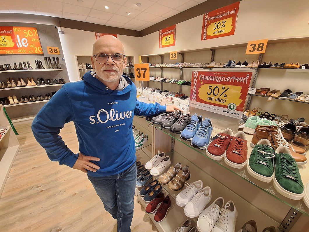 Einige Kundinnen sehen sich neugierig um, offenbar auf der Suche nach Schnäppchen. Der Räumungsverkauf in der „Quick Schuh“-Filiale am Einkaufspark In der Mark in Kirchlengern ist gestartet. „Am 15. November ist der letzte Tag“, verrät Jörg Greife, Inhaber und Verkäufer.