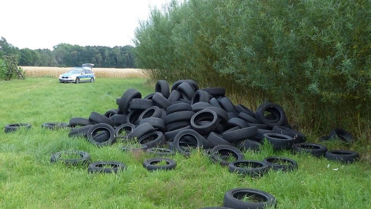Einen großen Haufen alter Reifen haben Unbekannte an einem Feldweg abgeladen. Die Polizei sucht nach Zeugen, die die Tat gesehen haben.