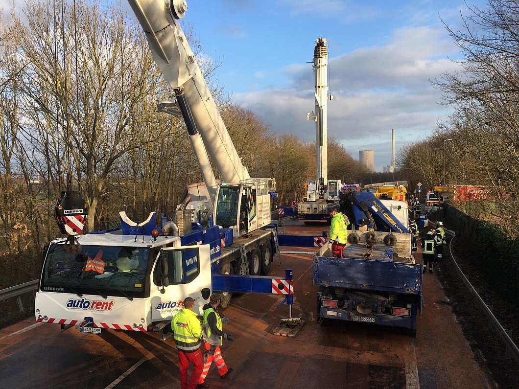 Inzwischen wird der Lastwagen nicht mehr durch die Feuerwehr sondern durch die Firma Autorent gesichert. Die nötigen Autokräne sind noch nicht eingetroffen. Nach der Bergung muss das Zugfahrzeug zunächst leergepumpt werden.
