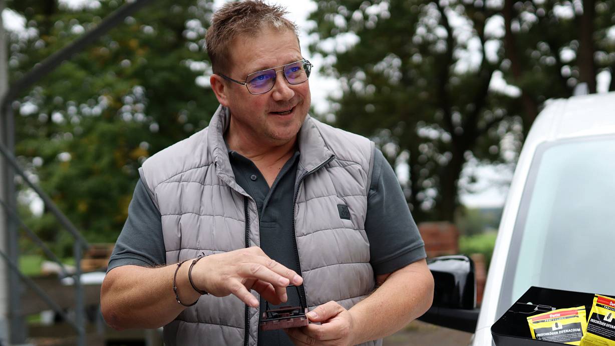 Mirko Opitz zeigt die Funktionsweise einer Mausefalle. Er ist viel im Kreisgebiet unterwegs, einige seiner Kunden wohnen auch weit entfernt. Im Jahr legt er daher rund 60.000 Kilometer mit dem Auto zurück. | © Alex Lehn
