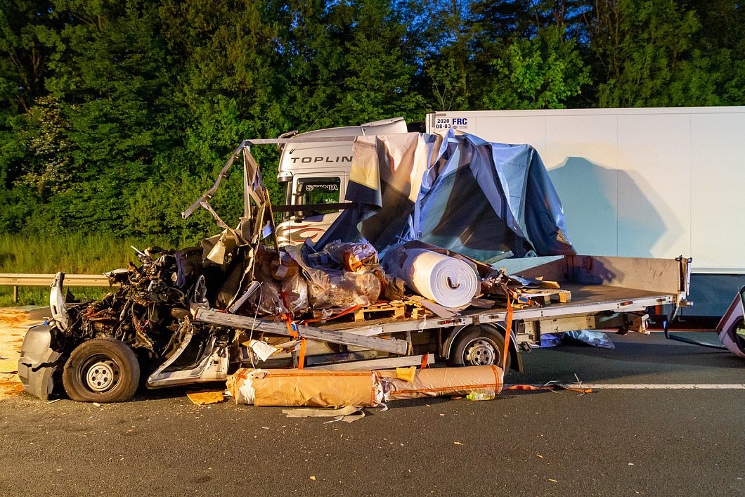 Wie die Polizei mitteilte, hatte sich auf der rechten Fahrbahn ein Stau vor einer Nachtbaustelle gebildet. Der noch unbekannte Fahrer des Klein-Lkw erkannte dies zu spät und fuhr nahezu ungebremst seitlich auf das Heck eines polnischen Sattelzuges auf, der am Stauende stark abbremsen musste. Der 31 Jahre alte polnische Fahrer dieses Sattelzuges wurde nicht verletzt.