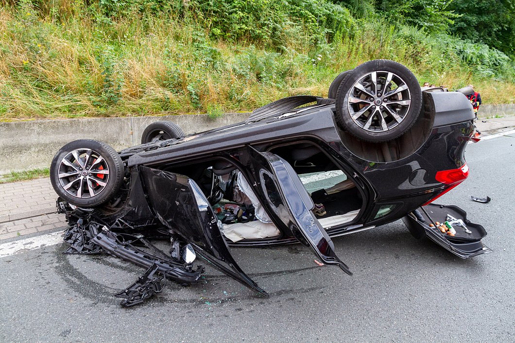 Der schwarze Volvo hatte sich mehrfach überschlagen und war auf dem Dach liegen geblieben. Das Fahrzeug lag auf dem Beschleunigungsstreifen des Rastplatzes Fuchsgrund. Die Fahrerin wurde bei dem Unfall verletzt und ins Krankenhaus transportiert.