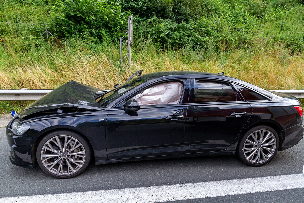 Der Audi stand etwa in Höhe des Schildes „1000 Meter Abfahrt Veltheim" auf dem Standstreifen. Er war an der Front und an der Beifahrerseite erheblich beschädigt. Alle Airbags hatten ausgelöst, die beiden Insassen wurden vom Rettungsdienst betreut. Sie wollten jedoch nicht in Krankenhaus gefahren werden.