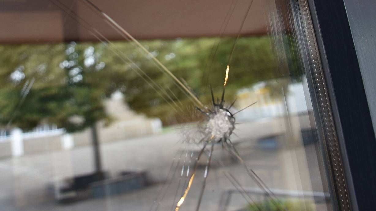Eine Glasscheibe ist seit mehreren Wochen beschädigt. Anscheinend versuchten Einbrecher Mitte Juli ins Schulgebäude zu gelangen. Einige kreisrunde Löcher in der Scheibe sind offenbar etwas älter.