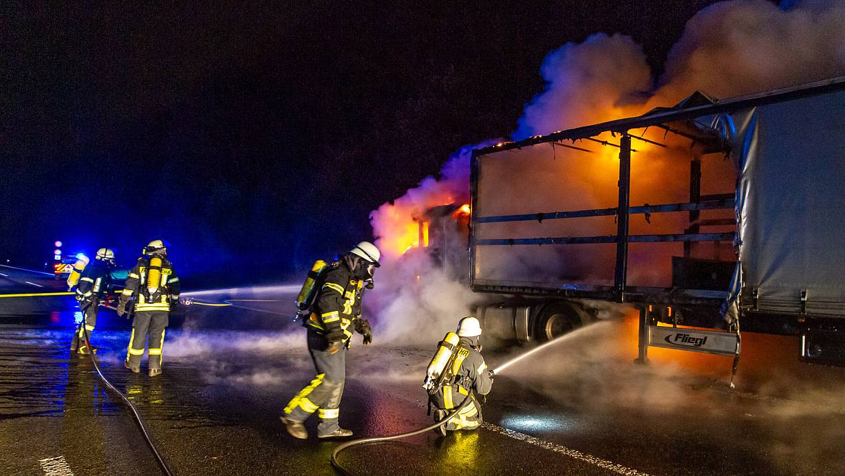 Bei Eintreffen der Feuerwehr stand die Zugmaschine in Vollbrand, das Feuer hatte bereits auf den Auflieger übergegriffen und die anliegende Böschung erfasst. Der Fahrer hatte sich in Sicherheit bringen können, er wurde rettungsdienstlich untersucht - musste aber nicht ins Krankenhaus.