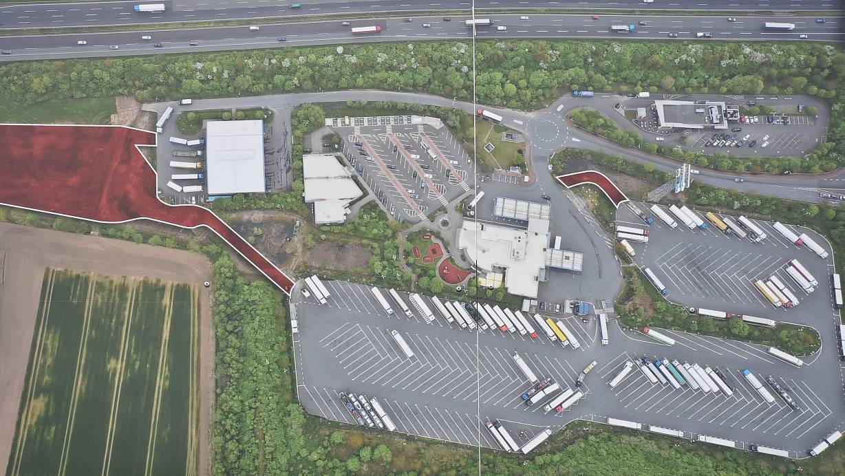 Erweiterung im Randbereich: Diese Vogelperspektive zeigt die neuen Lkw-Parkplätze (die rote Fläche links), die von der Autohof-Zufahrt aus betrachtet direkt hinter der Lkw-Waschanlge liegen und über eine neue Zufahrt erreicht werden. Foto: privat | © Dirk Haunhorst