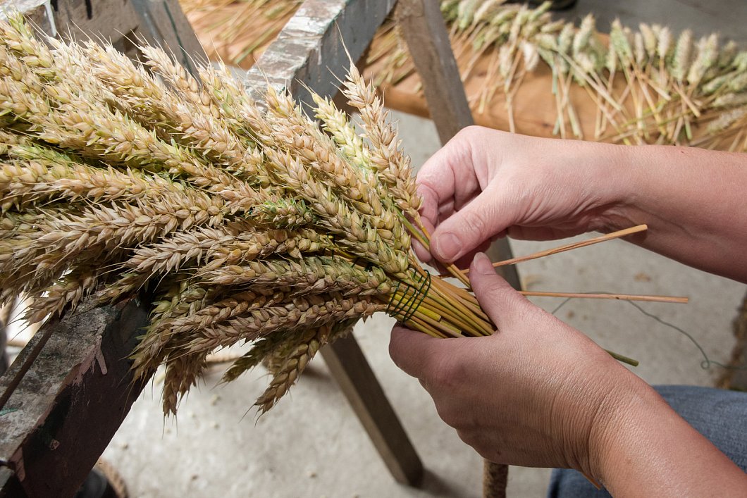 Für das Schneiden des Weizens und das Binden einer Girlande waren gleich mehrere Treffen nötig. 13 Meter Seil sollten möglichst gleichmäßig mit Ähren umwunden werden. Selbst für diejenigen Landfrauen, die schon viele Kränze aus Tannenzweigen gebunden hatten, war das Neuland. Jede hatte ihre Aufgabe: die Halme von den Blättern zu befreien und auf einheitliche Länge zu kürzen, aus den Ähren kleine Sträußchen vorzubereiten, das eigentliche Binden.