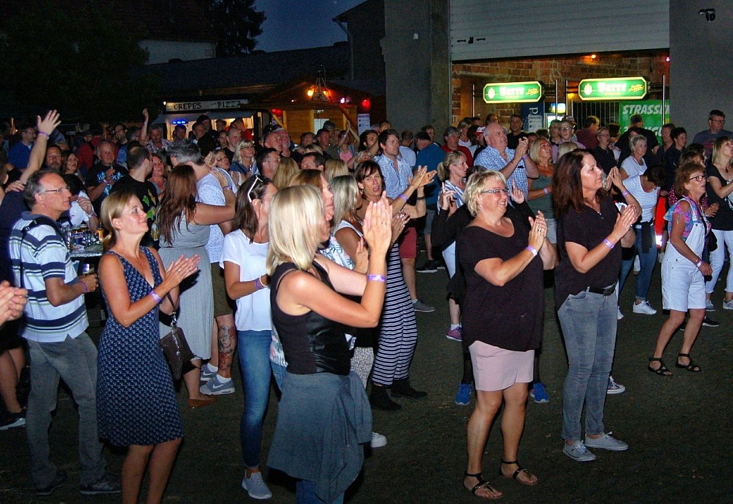Aber auch die beiden Hauptacts des Börninghauser Open-Air-Konzertes ließen nichts anbrennen. Zunächst die „Cone Brothers" mit einem soliden 50er-Jahre-Rock-und-Rockabilly, der sofort ins Blut ging. Die Band legte sich richtig ins Zeug, spielte Songs von Elvis Presley, Eddie Cochran, Buddy Holly und den Everly Brothers. Diesmal waren nur drei Brüder an Bord, der vierte war bei einer Feier, weshalb die Band ein Selfie mit Publikum aufnahm, „damit er sieht, wie geil es hier ist". Und tatsächlich: Bei den „Cones" ging so richtig die Post ab. Die Gäste strömten auf die Tanzfläche, manche im Petticoat, andere mit Schlaghosen und Brillantine im Haar.