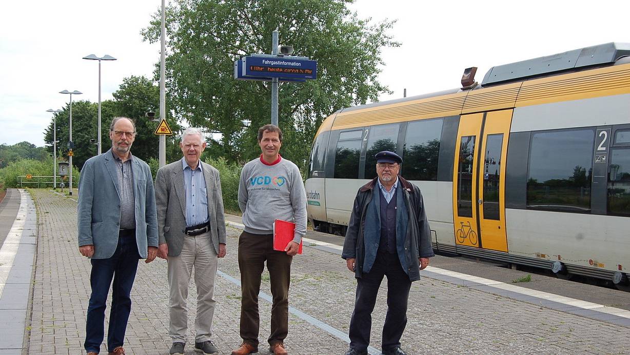 Die Region soll zum Zug kommen: Uwe Hartmeier (VCD Lübbecke, v. l.), Rainer Engel (Pro Bahn), Thomas Dippert (VCD-Kreisverband) und Klaus Haasis (Initiative Wittlager Kreisbahn) stellten das Konzept für die Reaktivierung vor. | © Sandra Spieker