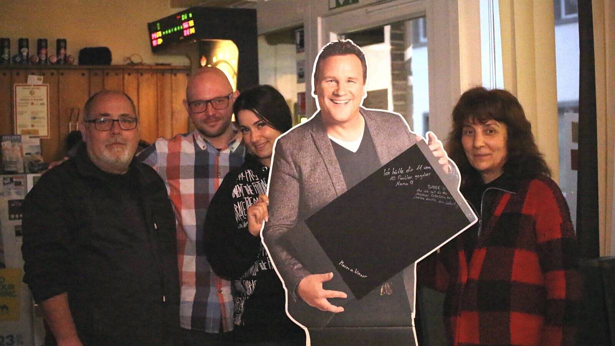 Frank Blinde (v. l.), Robert Marske, Ilona Marske und Iliyana Groppel schauen sich die Ausstrahlung gemeinsam in der Espresso Bar an. Ein Pappaufsteller von Guido Maria Kretschmer durfte dabei nicht fehlen. Auf dem Schild in seiner Hand haben sich schon einige Anwesende mit lieben Worten verewigt. | © Marske