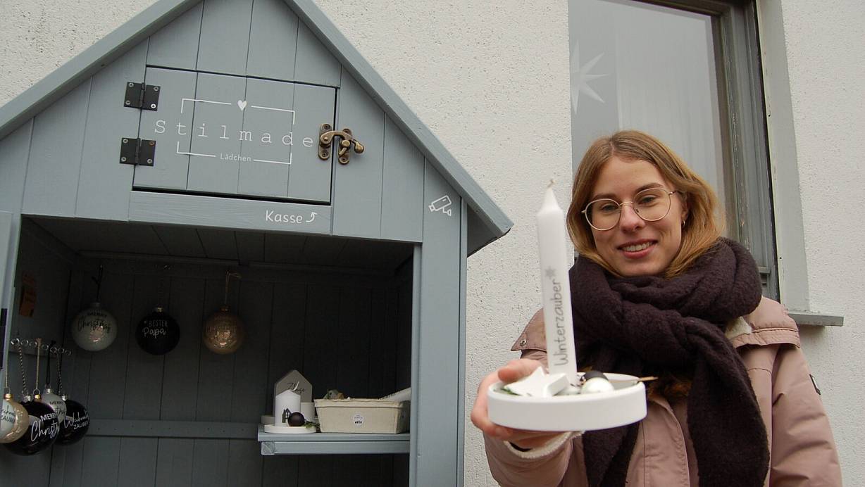 Alicia Lammersiek (23) nutzt jede freie Minute, um kreativ zu werden. In dem grauen Schränkchen an der Bremer Straße warten viele kleine Geschenkideen auf neue Besitzer.