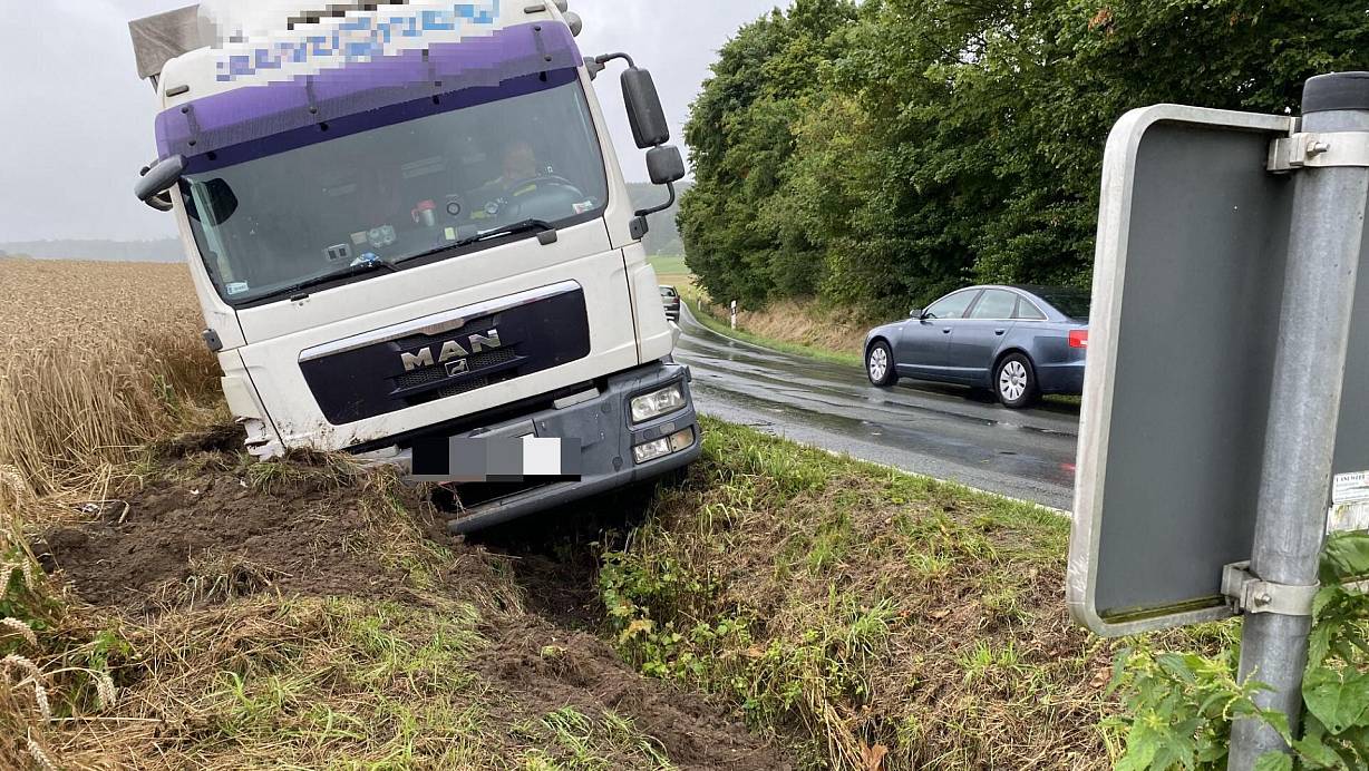 Lkw rutscht auf B65 in Minden-Lübbecke in Graben