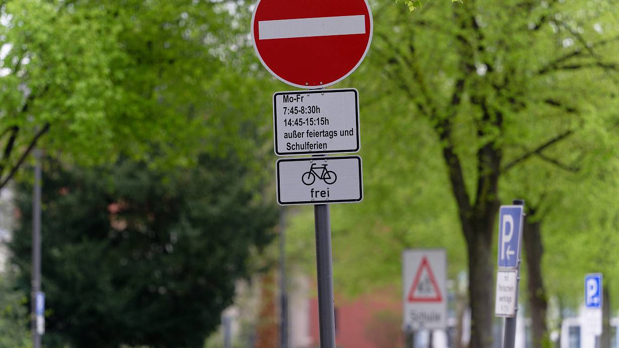 Ein Schild weist auf eine Sperrung einer Straße während der Bring- und Abholzeit einer in der Straße gelegenen Grundschule für den Autoverkehr hin. | © dpa
