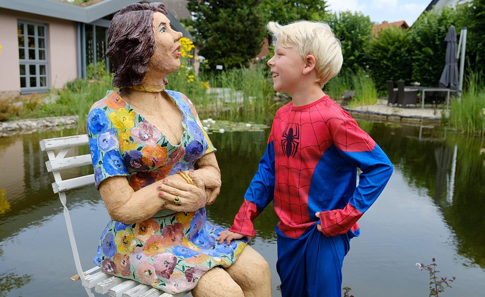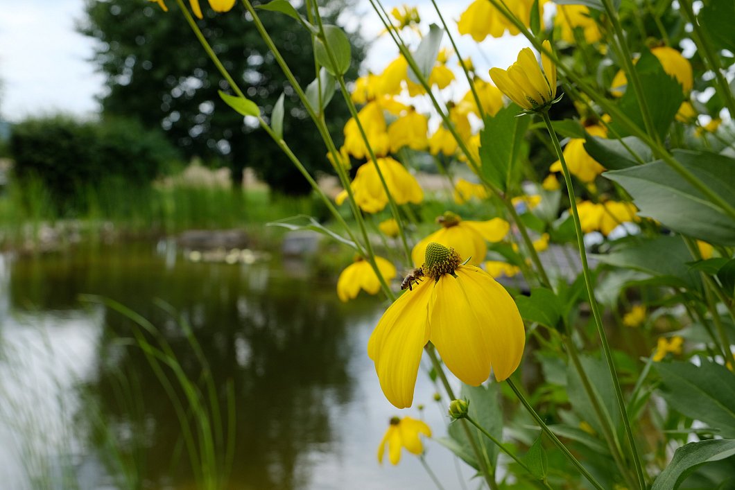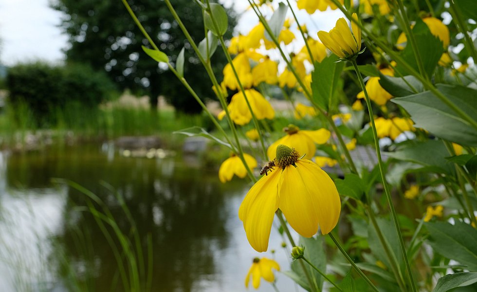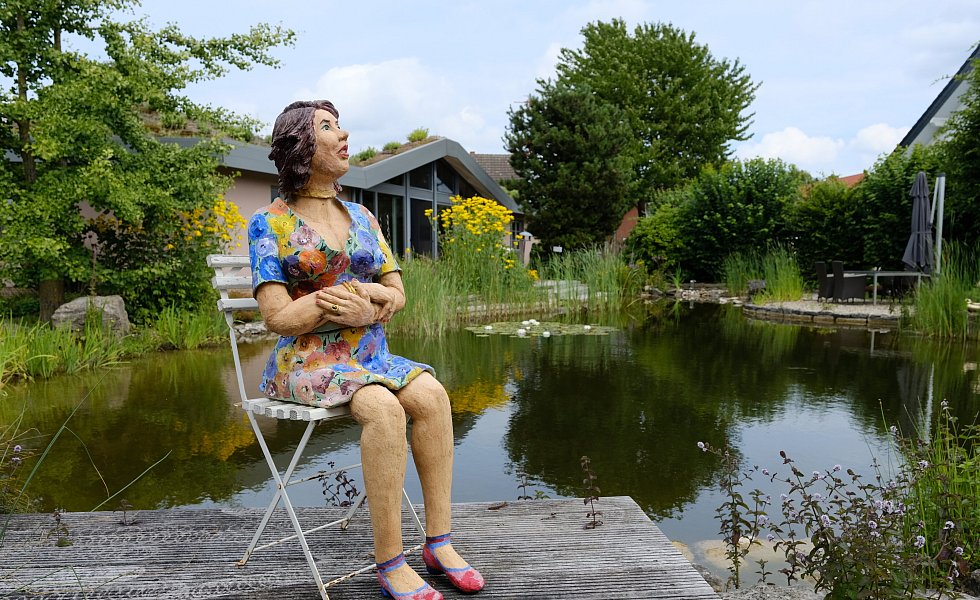 Neben unzähligen Gräsern und Seerosen zieren Froschlöffel und Sumpfdotterblume den Teichrand, es blüht mal gelb, mal blau. Auch am üppig bewachsenen Bachlauf, der als Filtergraben fungiert. Am See thront Lotti über allem und wurde schon häufig mit einer lebenden Person verwechselt. Lotti ist ein Kunstobjekt aus Terrakotta, eine lebensgroße Dame und ein Hingucker auf einer Holzterrasse am Ufer. Es sei Liebe auf den ersten Blick auf einem Gartenmarkt in Cloppenburg gewesen – genau wie zu dem goldenen Frosch, der am Ufer hockt.