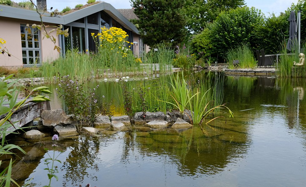 „Der Teich entstand beim Hausbau, weil der Bauherr Lehm für die Wände des Hauses benötigte, der direkt aus dem eigenen Garten kam“, weiß sie von den Vorbesitzern. Dass sie heute in dem 1,60 Meter tiefen Gewässer direkt vor ihren bodentiefen Wohnzimmerfenstern schwimmen gehen kann, hat eine Menge Arbeit gekostet. Schritt für Schritt haben sich die Beckmanns ihr Wissen um Garten und Teich erarbeitet. Sie nennen es ihr Bio-Kino und beobachten Schwalben, Meisen, Bussarde, Spechte, Milane, Libellen und sogar den Eisvogel am See. Auch die Schleiereule fühlt sich wohl.