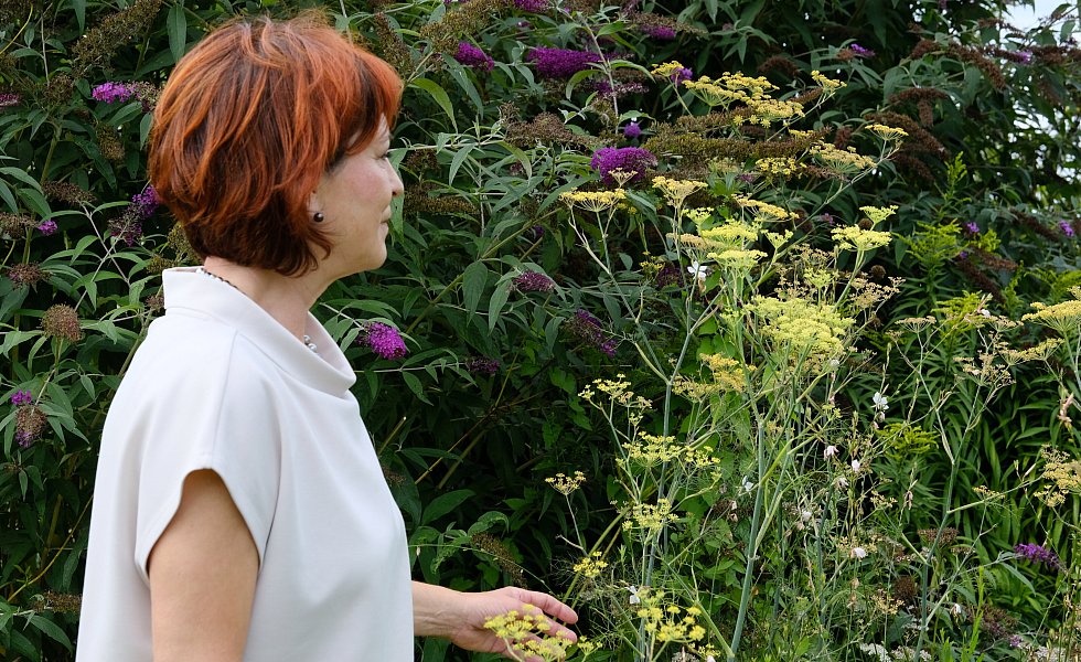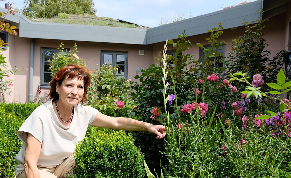 Rosen sind die Leidenschaft von Claudia Beckmann. Gerade beginnt die zweite Blüte der Rosenbüsche im Innenhof neben den üppigen Hortensien. In der rosa-lilanen Ecke blühen Phlox, Gladiolen, Lavendel, Eisenkraut und Storchschnabel als Bodendecker. Der Kräutergarten mit Lorbeer, Rosmarin, Koriander oder die rote Ecke mit dem Perückenstrauch und Cana, Schmetterlingsflieder und das selbst designte Hochbeet mit Schnittlauch, Salat und Petersilie auf der Rückseite des Walls, auf dem Margeriten und Wolfsmilchgewächse gedeihen, die Astern im Herbst – das Grundstück ist ein Biotop voller Leben. Zwei bis drei Mal im Jahr klettert Claudia Beckmann auf den mit Steingewächsen bepflanzten pflegeleichten Dachgarten und zieht Löwenzahn und Schafgarbe heraus.