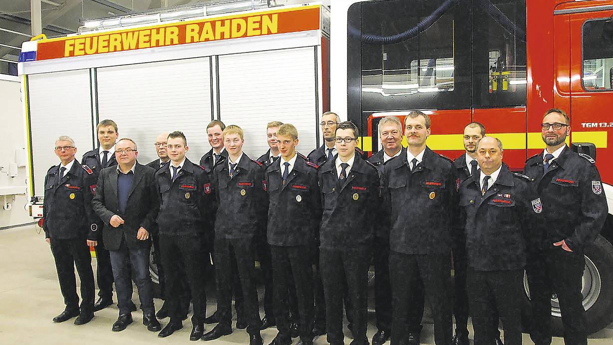 Der stellvertretende Leiter der Feuerwehr Rahden, Carsten Kunter, übergab Urkunden an die Lehrgangsteilnehmer. Dann beförderte er Wilm Harder zum Feuerwehrmann und Janek Bunge, Steffen Hackemeier, Marcel Rohlfing und Steffen Schlüter jeweils zum Oberfeuerwehrmann. Die Abzeichen in Bronze für den Leistungsnachweis verlieh er an Rafael Kolkhorst, Finn Riesmeier, Wilm Harder und Ralf Wüstendörfer. Das Abzeichen in Silber für den dritten Start in Hille bekam Steffen Hackemeier.