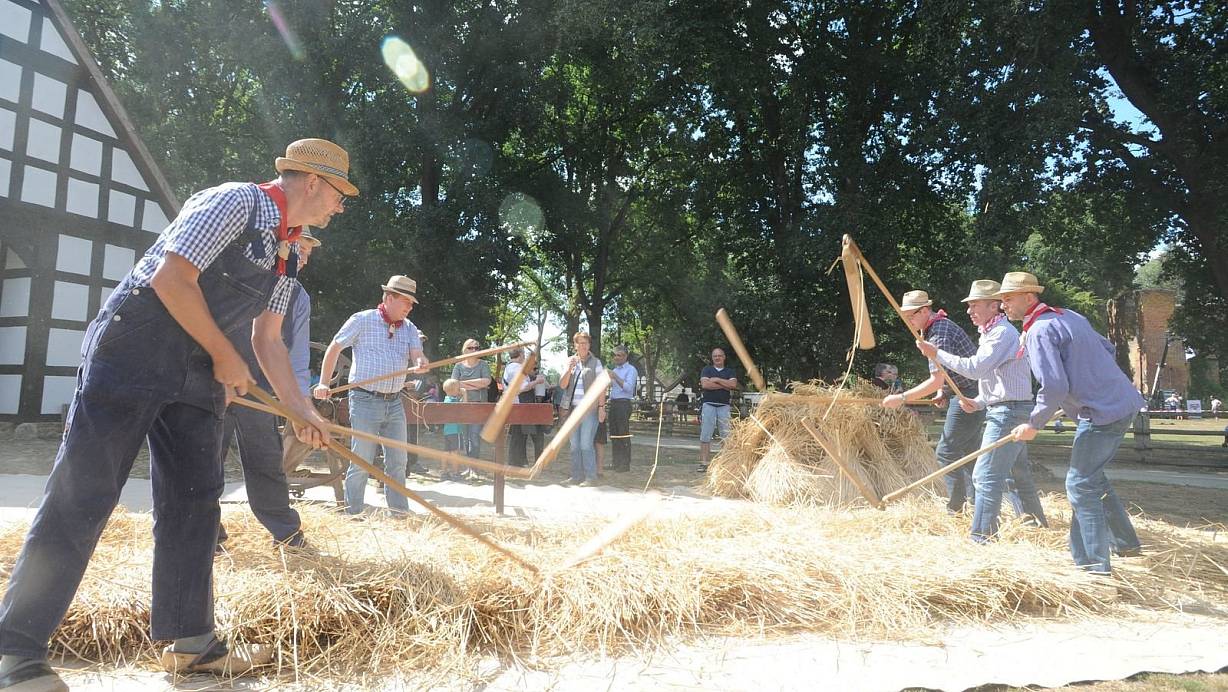 Im Rahdener Museumshof wird altes Handwerk vorgeführt - etwa das Dreschen im Sechsertakt durch die Heimatfreunde aus Sielhorst. | © Joern Spreen-Ledebur