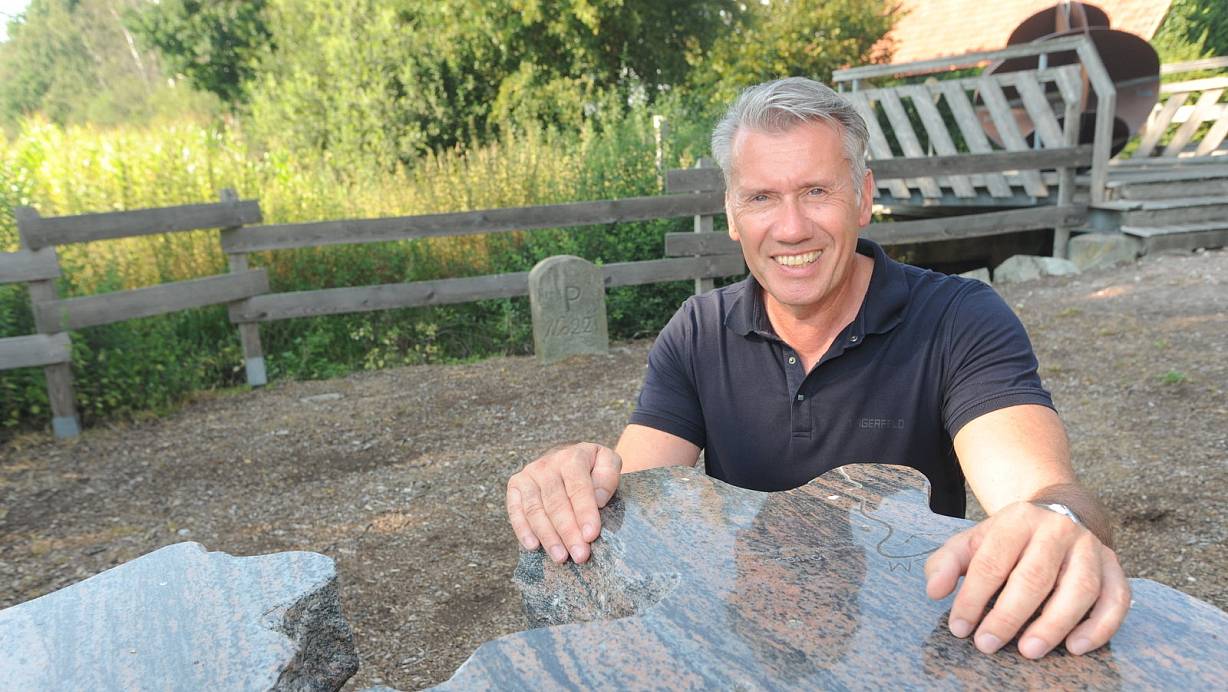 Bert Honsel bewirbt sich für die CDU erneut um das Bürgermeisteramt in Rahden, der nördlichen Stadt von NRW. Die Lage der Stadt wird deutlich an der Reliefplatte mit den Umrissen NRWs am Nordpunkt in Pr. Ströhen. | © Joern Spreen-Ledebur