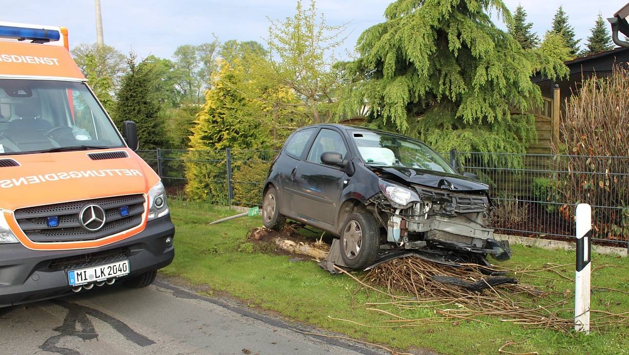 Die Frau verliert offenbar in einer Kurve die Kontrolle über ihren Twingo und kommt damit von der Straße ab. Ein Notartzt kümmert sich noch vor Ort um sie.